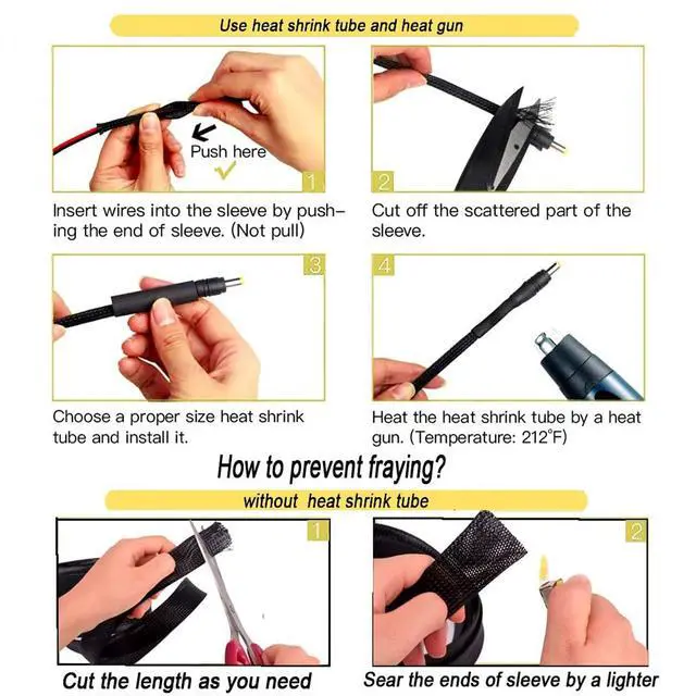 Recommended: Cut braided sleeving with a hot knife to prevent fraying. If a hot knife is not available, be sure to sear the edges with another heat source (for example, use the flame from a lighter).
