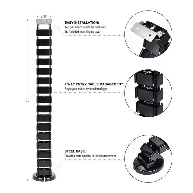 A metal weighted base provides stability for the spine and the cords routed through it. Slide each cable through the slot into one of four channels within the cable manager, to keep cables organized and help prevent trips over cables on the floor.