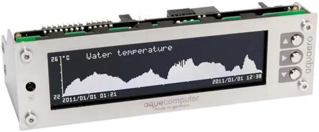The aquaero is an absolutely autonomous working microprocessor-controlled device with USB 2.0 interface. All speed parameters and sensor values can be set and visualized in an user-friendly menu or through an even easier to use PC-software. Additionally, the graphic LC display can be used to display almost any information using the popular LCD software LCDHype.
