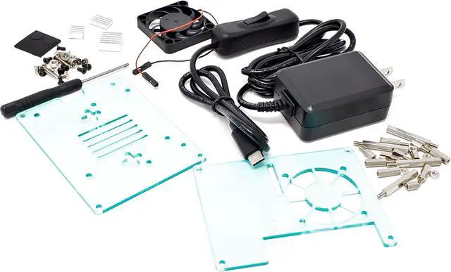 Contents: Acrylic Case, Power Adapter, Fan, Heat Sinks, Feet Pads, Screw Driver, Screws, Standoffs