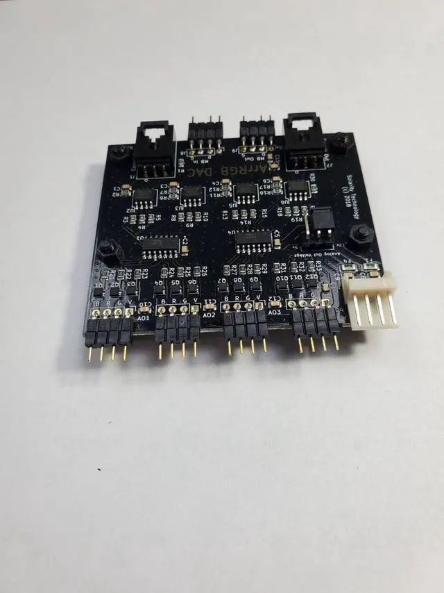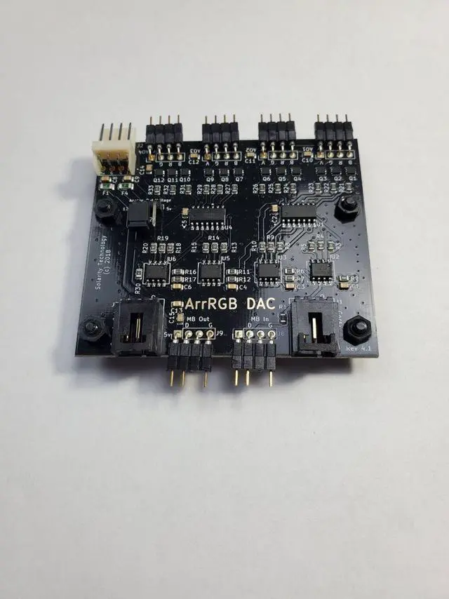 Solarity Technology presents the "ArrRGB DAC"! The ArrRGB DAC Rev. 4.1 is a 4 channel RGB device that allows you to use a 5v or 12v Digital/Addressable signal from a motherboard header or RGB controller and control Analog RGB devices on 4 different channels via the digital signal. This device requires an addressable signal to work; it will not function without a controller/MB header. You can daisy-chain additional RGB DACs or other RGB devices from the digital output. Unlike the input, both “ Corsair Out” and “ MB Out” can be used at the same time.