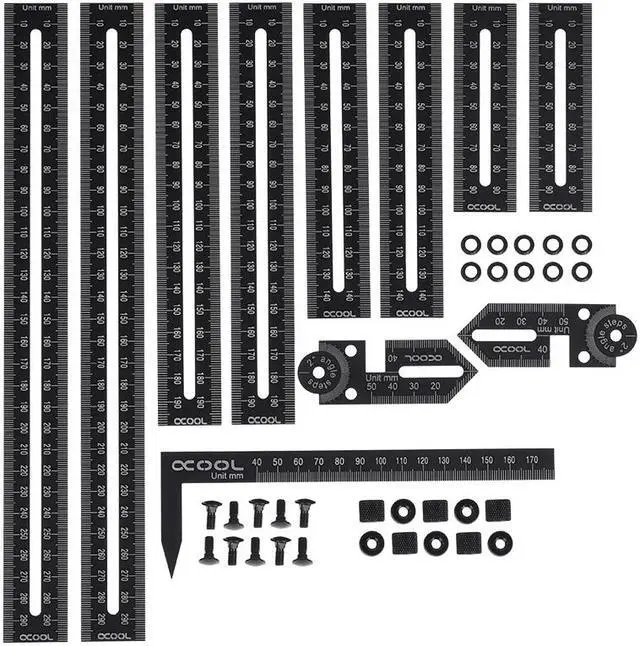 The set includes rulers in different lengths, as well as corresponding angles and a distance metre. With the included screws, all the rulers can be attached to one another and can slide along their guiding slots. This lets you measure not just one angle but several angles and straight sections at the same time. Then, the screws can all be tightened so nothing slides around. Now the whole thing can be placed on a heat-proof surface and the HardTubes can be heated and bent with an Alphacool Heatgun.