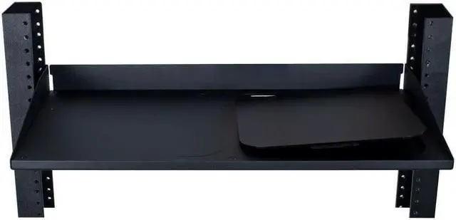 The RackSolutions Mini Rack Duo Shelf is designed for optimal use in 19-inch server racks, making it an excellent choice for homelabs, small studios, and data centers. This compact shelf accommodates up to 2 Mac minis within less than 1U of space and installs effortlessly without the need for tools. Its passive ventilation system isolates hot and cold air, enhancing cooling efficiency by directing cool air through the shelf's lower chamber and expelling warm exhaust. Laser cut acrylic cutouts ensure a secure fit for each Mac mini. This shelf is suitable for a variety of applications including virtual systems, server clusters, render farms, MacOS servers, and Apples Developer Transition Kit.