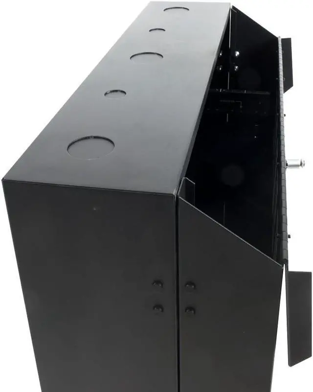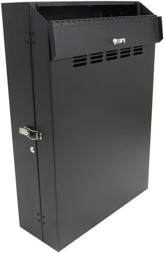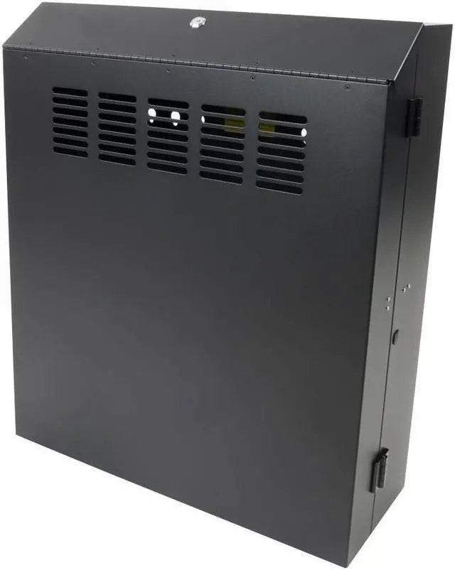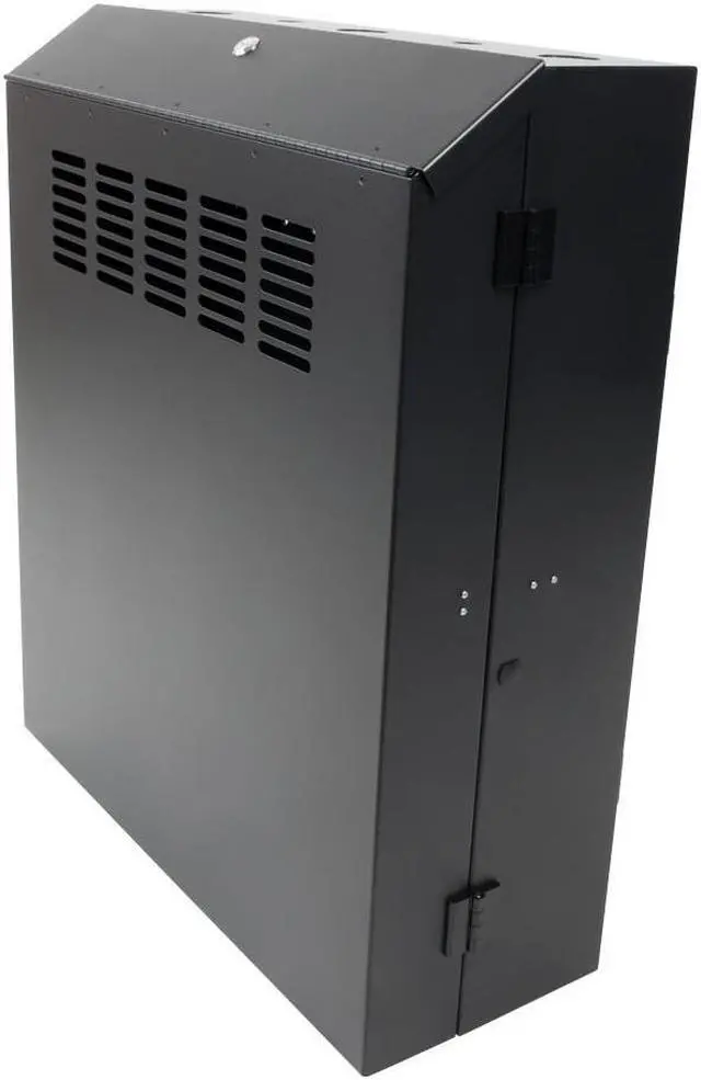 The RackSolutions 5U Secure Vertical Wall Mount with Hinged Door is designed to securely mount 19" rack equipment in a space-saving vertical orientation. This wall mount rack features a lockable hinged door and top cover, providing enhanced security and easy access to servers, patch panels, UPS systems, and network switches. With 12 punch outs for cable management and the ability to install up to (2) 120mm fans on the vented bottom, this enclosure ensures optimal airflow. The 5U vertical wall mount offers 2U of extra rack space for patch panels and supports a maximum load of 150 lbs.