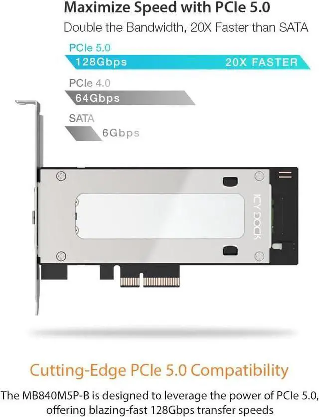 The MB840M5P-B is designed to leverage the power of PCIe 5.0, offering blazing-fast 128Gbps transfer speedsdouble the bandwidth of PCIe 4.0 (64Gbps) and over 20x faster than SATA (6Gbps).
