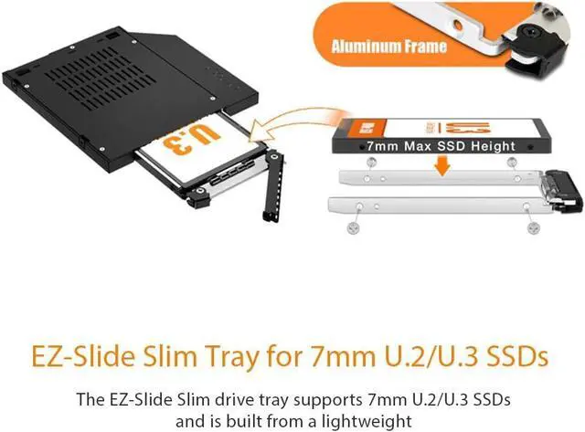 The EZ-Slide Slim drive tray supports 7mm U.2/U.3 SSDs and is built from a lightweight, one-piece aluminum frame, offering superior rigidity and heat conduction.