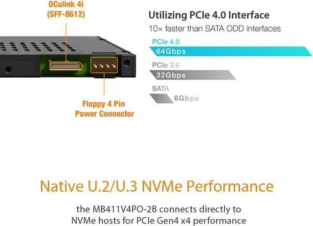 OCuLink 4i PCIe Gen4 x4Equipped with a native OCuLink 4i (SFF-8612) interface, the MB411V4PO-2B connects directly to NVMe hosts for PCIe Gen4 x4 performance, delivering up to 64Gbps transfer bandwidth - over 10× faster than traditional SATA ODD interfaces (6Gbps).