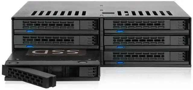 The ICY DOCK ExpressCage MB326SP-1B is a 6-bay 2.5 SATA/SAS SSD/HDD mobile rack that fits into a standard 5.25 optical drive bay, ideal for NAS servers, homelab systems, compact workstations, and small business servers. It combines high-density storage with ICY DOCKs proven tool-less removable tray design, allowing quick hot-swaps and easy maintenance while securely supporting drives from 59.5mm in height.