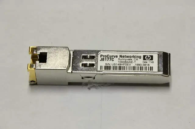 * Application/Usage: Data Networking<br /> * Product Type: SFP (mini-GBIC)<br /> * Interfaces/Ports Details: 1 x 1000Base-T<br /> * Product Type: SFP (mini-GBIC)<br /> * Interfaces/Ports Details: 1 x RJ-45 1000Base-T Network LAN<br /> * Network Technology: 1000Base-T<br /> * Product Name: ProCurve Gigabit Ethernet SFP mini-Gbic<br /> * Network Technology: 1000Base-T<br /> * Product Line: ProCurve<br /> * Brand Name: HPE-IMSourcing<br /> * Brand Name: HPE-IMSourcing<br /> * Ethernet Technology: Gigabit Ethernet<br /> * Product Family: ProCurve<br /> * Media Type Supported: Twisted Pair<br /> * Ethernet Technology: Gigabit Ethernet<br /> * Media Type Supported: Twisted Pair<br />* Product Type: SFP (mini-GBIC)<br /> * Interfaces/Ports Details: 1 x 1000Base-T<br /> * Network Technology: 1000Base-T<br /> * Brand Name: HPE-IMSourcing<br /> * Ethernet Technology: Gigabit Ethernet<br /> * Product Family: ProCurve<br /> * Media Type Supported: Twisted Pair<br />