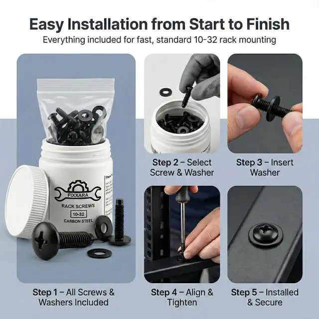 Complete Kit for Easy Installation:: Complete rack screw set of 50 with washers, organized in a convenient jar for quick access during any rackmount installation project