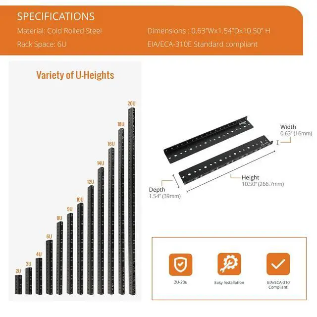 The Tecmojo vertical server rack rails are designed to mount your network and telecom equipment such as servers, switches, patch panels and PDUs securely. Silk screened Rack Unit measurements and pre-tapped with 12-24 threading across the entire length for convenient equipment mounting. All equipment mounting hardware is included. The kit comes in pair and can be attached to wooden frame, workstation or other DIY projects. Available in sizes from 2U to 20U.