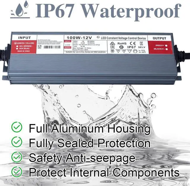 [Ultra Thin Aluminum Housing]: The transformer for lighting adopts aluminum alloy housing which is IP67 Waterproof level, well heat dissipation and it is fullly filled inside to protect components operation stability.