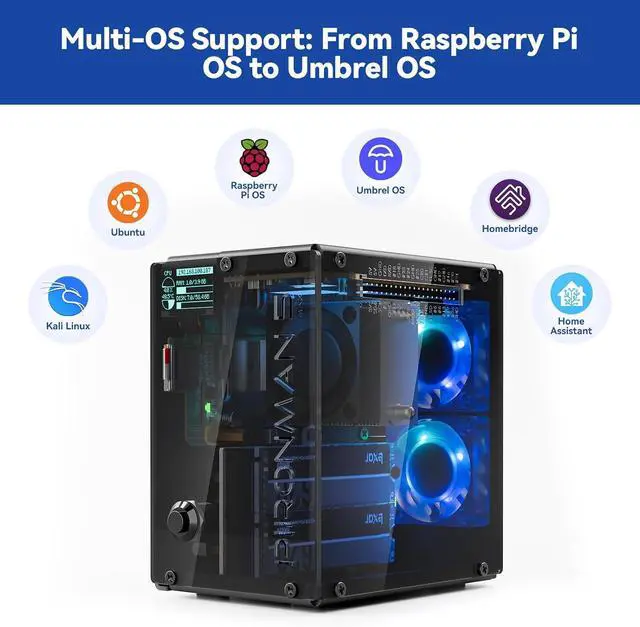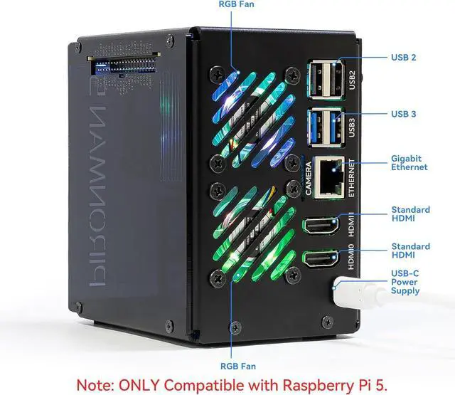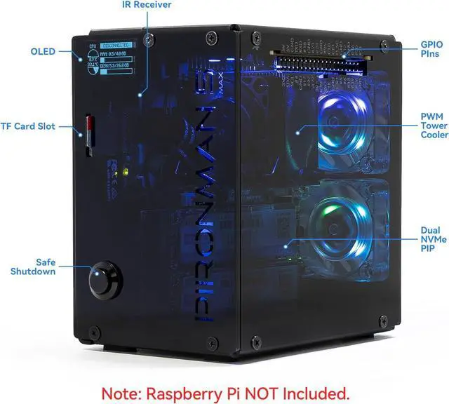 - Raspberry Pi 5-MAX PC Case: Unlock the full potential of your Raspberry Pi 5 with the Pironman 5-MAX our most advanced case yet. Featuring dual NVMe M.2 slots with RAID 0/1 support, AI accelerator compatibility ( e.g. Hailo-8l M.2 AI), a PCIe Gen2 switch, PWM tower cooling + dual RGB fans, dual transparent panels with RGB lighting, and a smart OLED display with vibration wake-up. All ports are optimized for cleaner cable management, including dual full-size HDMI and USB-C power, supports 4K video output. Making it ideal for building high-performance NAS, AI edge computing devices, Home Assistant hubs, gaming and more. (Raspberry Pi NOT Included)