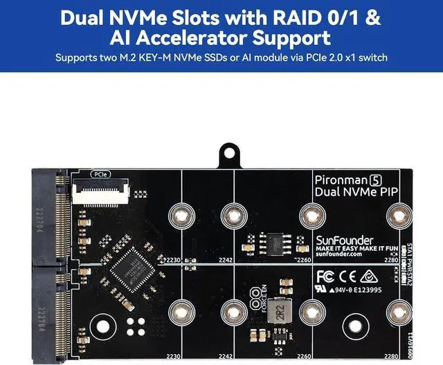 - Dual Expandable NVMe M.2 Slots: Supercharge your Raspberry Pi 5 with two easy-to-install NVMe M.2 slots (2230, 2242, 2260, 2280), powered by a built-in PCIe Gen2 switch. Supports RAID 0/1 for high-speed NAS setups, or flexible combinations like one NVMe SSD and one Hailo-8L AI accelerator for advanced edge AI applications and performance boost