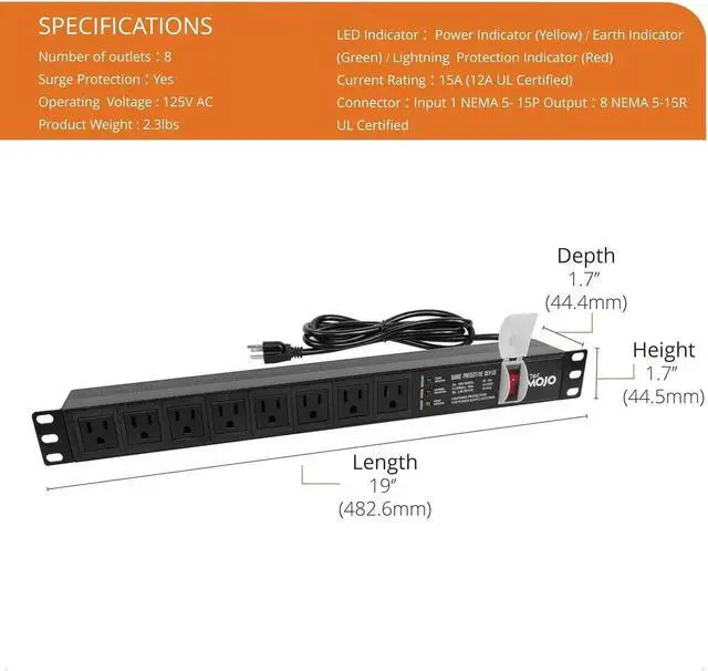 Efficient Power Distribution: Delivers 15A (US Listed 12A) power through 8 NEMA 5-15R ports, ideal for server racks, network setups, and office environments.