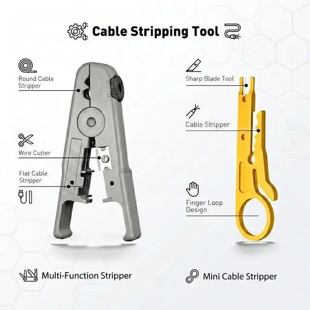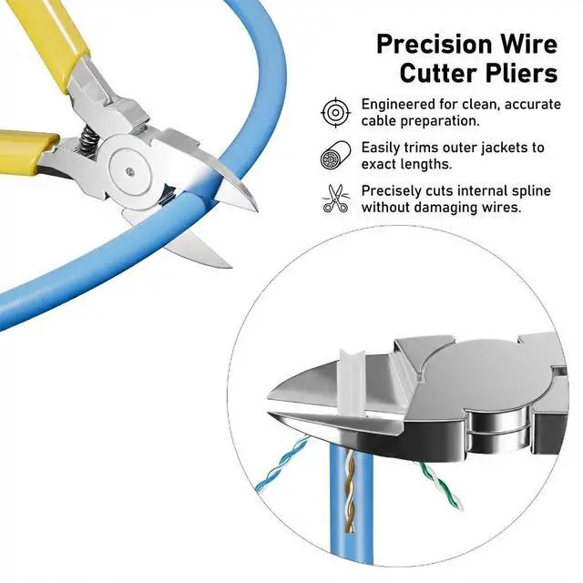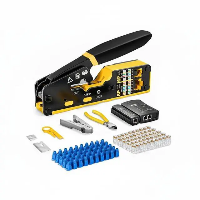 The [Brand Name] RJ45 Crimping Kit provides everything needed for cutting, stripping, and crimping ethernet cables. Featuring Pass-Through Technology, it allows wires to pass through the connector for visual verification, ensuring a perfect crimp every time.