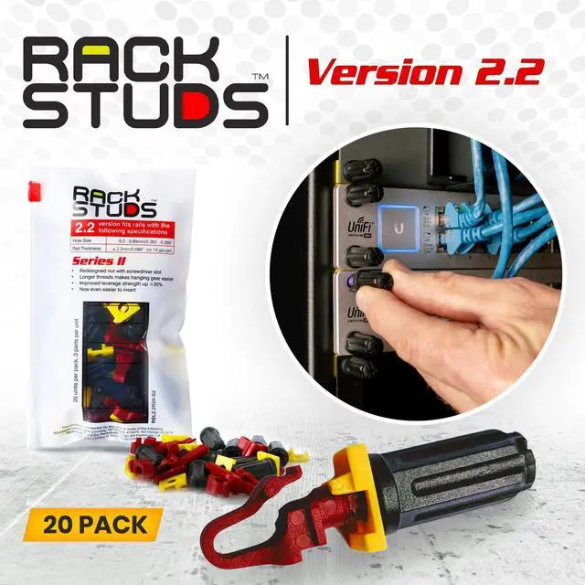 • EASY INSTALLATION: Rackstuds make rack mounting your server rack accessories and network hardware 30% faster by eliminating the need for traditional cage nuts. The unique design allows you to install from the front, so you can skip the hassle of reaching behind the rack and fumbling with cage nuts, saving you time and frustration. Enjoy a quicker, more efficient install with every use.