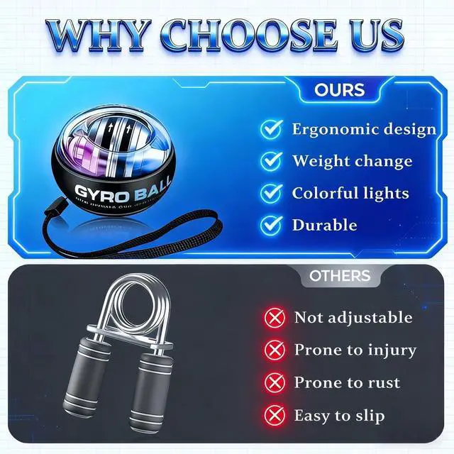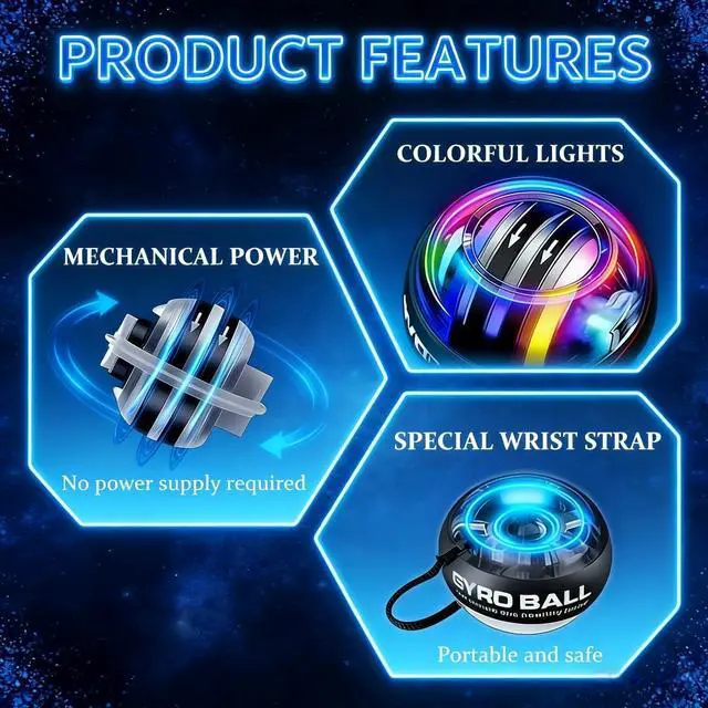 Unlock Your Grip Strength with the Power Gyro Ball Discover the ultimate hand, wrist, and forearm workout that's as entertaining as it is effective. Our Auto-Start Wrist Ball isn't just another hand exerciser - it's a dynamic training tool that adapts to your effort, providing increasing resistance the faster you spin. THE CHALLENGE & THE REWARD Mastering this torque ball takes a moment of practice, but the payoff is immense. With a gentle wrist motion, you'll activate the internal rotor, generating powerful gyroscopic force that works your muscles through every repetition. It's a satisfying sensation that keeps you coming back for more. MOTION-POWERED LED ILLUMINATION Watch as your progress lights up - literally. The high-speed rotation powers the built-in LED lights, creating a stunning visual effect. No batteries required, just your own energy. It's the perfect stress-relief fidget toy for the office or a unique conversation starter. COMFORT & RECOVERY BENEFITS Beyond fitness, our wrist ball is a proven tool for hand and wrist conditioning. It's designed to improve blood circulation, enhance joint mobility, and gently strengthen the muscles and tendons of the wrist and forearm. It's an effective aid for those suffering from carpal tunnel syndrome, tendonitis, or recovering from a fracture. BUILT FOR ATHLETES, GAMERS, AND SENIORS Whether you're a climber needing crushing grip, a golfer looking for more swing power, a gamer wanting to reduce hand fatigue during long sessions, a musician aiming for finer finger control, or a senior maintaining hand strength - this power ball delivers. The ergonomic, non-slip silicone grip ensures comfort and control during even the most intense workouts. WHAT'S IN THE BOX - 1 x Power Gyro Ball - 1 x Shatter-Resistant Safety Rope (MUST USE to prevent damage and injury) - 1 x User Manual Take on the challenge. Feel the power. Get your Wrist Ball today!