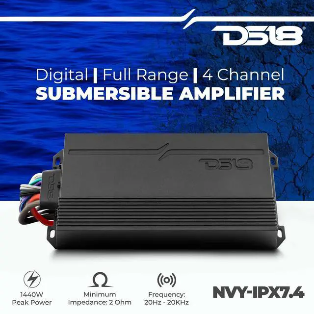 DS18 NVY-IPX 7.4 Marine Amplifier Submersible 4-Channel Class D 4 Ohms 1440 Watts Full-Range Digital Rating IPX7 Waterproof AMP - Great for Boats, Powersports & Motorcycles