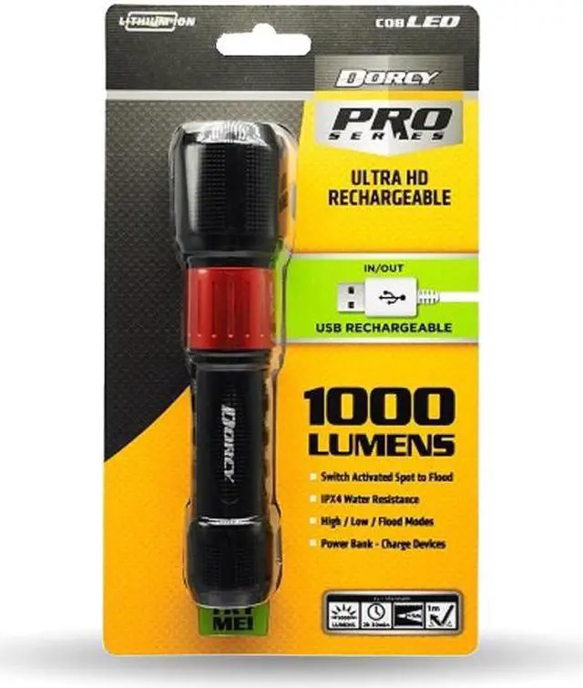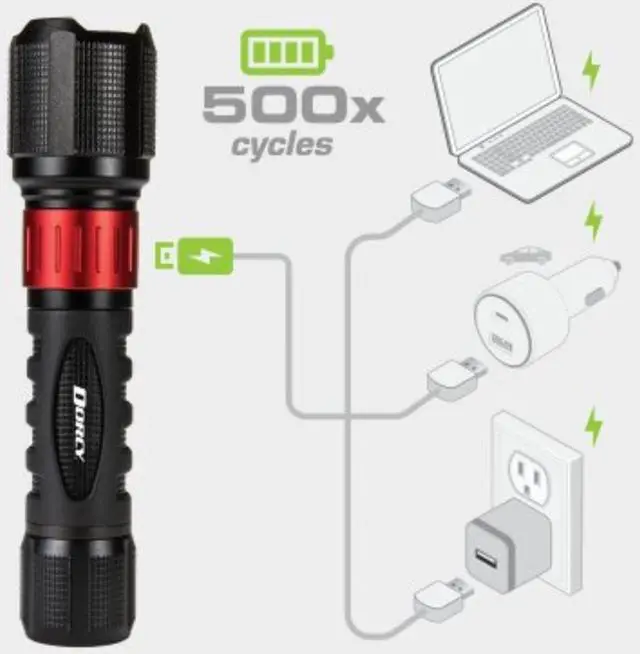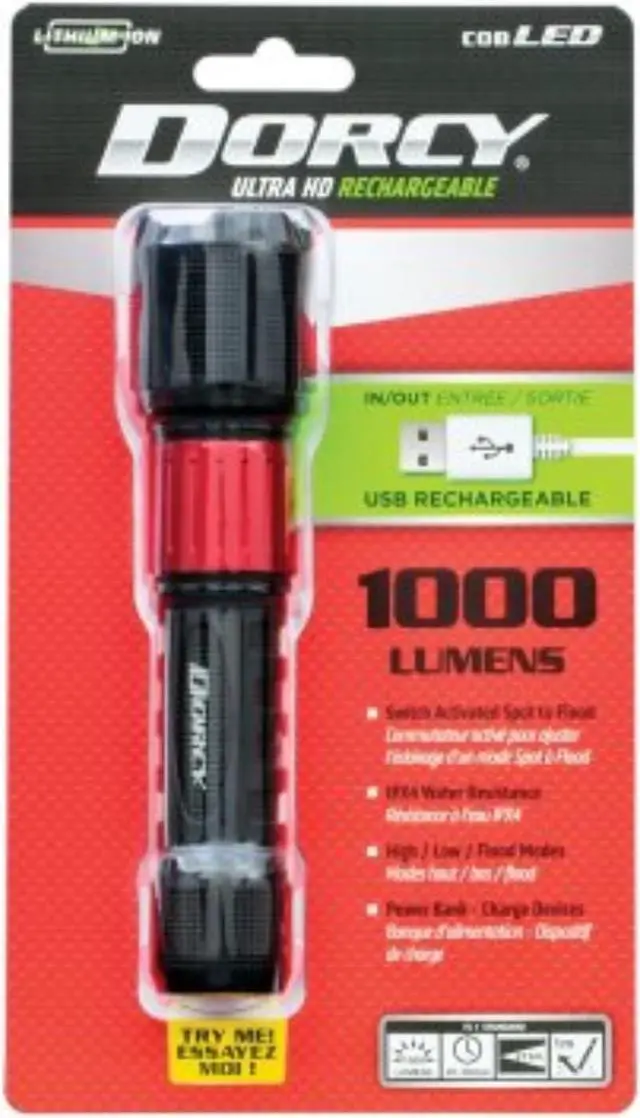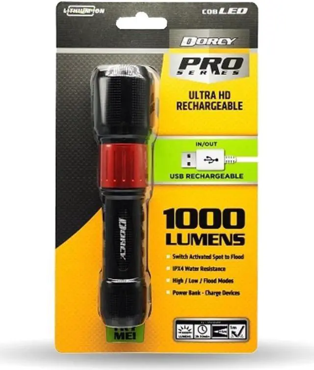The Dorcy 1,000 Lumen USB Rechargeable Instant Spot Flood Flashlight features an intense beam of light that projects an output of 705 ft. Constructed of durable, aircraft-grade anodized aluminum, this light contains 2,000 mAh of Li-Ion battery power for extended run times. Other features include rechargeability via USB, power bank functionality, and a recessed tail cap. With multiple light output modes, you can be in control of the beam, brightness, and run time.