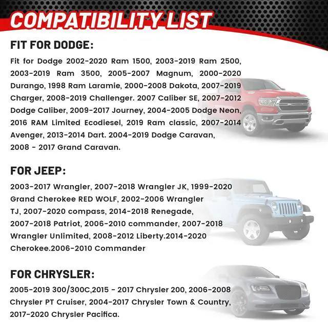 | 2003-2019 Jeep Dodge | 2005-2022 Dodge Jeep | 2003-2019 Jeep Dodge | 1992-1996 Jeep Dodge | 2007-2011 Jeep Dodge | 2011-2022 Jeep Dodge | 1995-2009 Dodge |