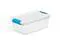This container can be opened with one hand - the second latch acts as a handy hinge. The clear base is great for quickly viewing contents and the recessed lid makes it great for stacking. With a 6-quart capacity, this box solves all kinds of storage dilemmas. It fits neatly on a 16-inch wire shelf and features a new space-saving design.