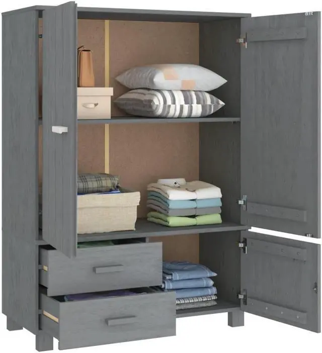 The wardrobe is made of solid pinewood, making it stable and sturdy. The clothes cabinet has doors and compartments, providing ample storage room for organizing your outfits and various other items neatly organized. The smooth sliding drawers provide extra, ample storage space for your underwear, socks, tec.