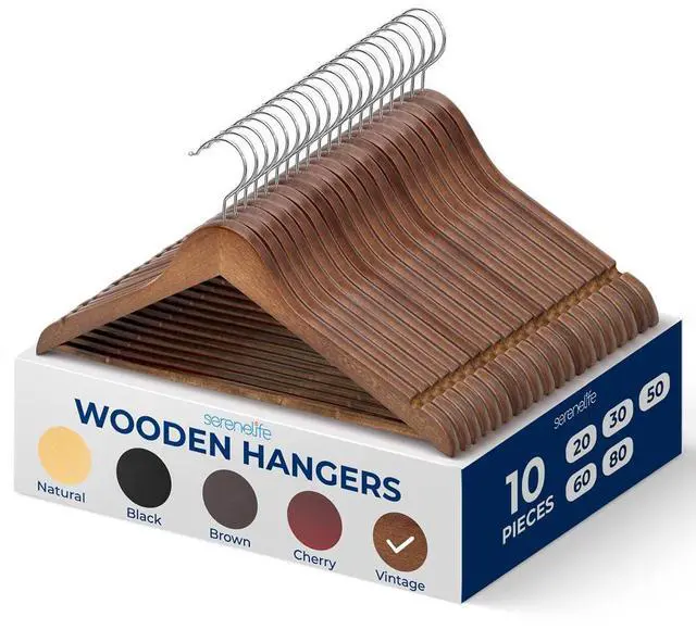 The SereneLife SLHWDVINT10 Wooden Hangers set includes 10 high-quality, non-slip hangers designed to provide durable and efficient closet organization. These hangers are perfect for hanging suits, coats, dresses, shirts, and pants. The hangers feature a 360° swivel chrome hook for easy access and hanging, and the notched design is ideal for securing delicate garments like camisoles. The smooth finish and natural wood grain add an elegant touch to your closet, while the heavy-duty construction ensures your clothes stay in shape. These hangers are both space-saving and sturdy, making them an essential addition to any wardrobe.