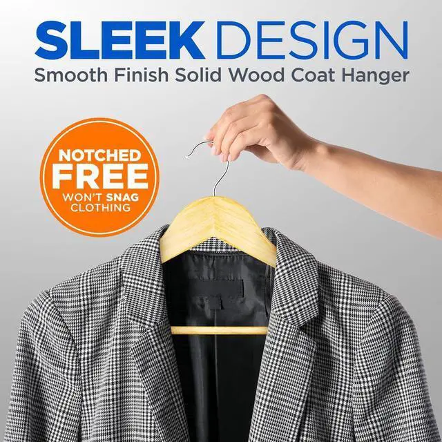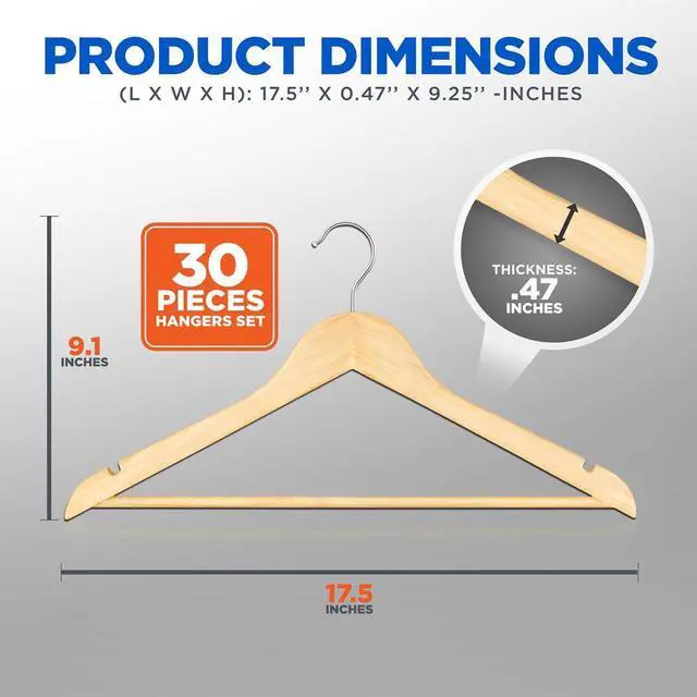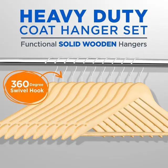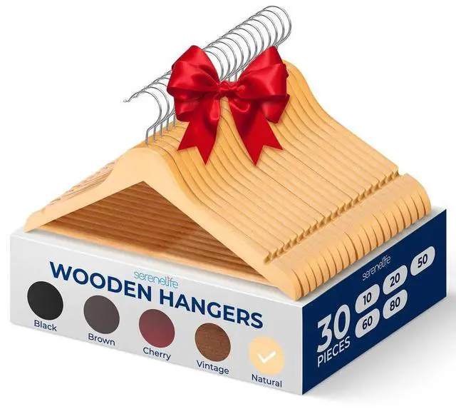 Elevate your closet organization with the SereneLife SLHWD30 Wooden Clothes Hangers. This 30-piece set features solid wood construction with a natural finish that adds both durability and elegance to your wardrobe. Each hanger includes a 360° chrome swivel hook, smooth finish, notched shoulders, and a built-in pants bar to accommodate a wide range of garments. Designed for function and form, these heavy-duty hangers are strong enough to support coats, suits, dresses, and moreup to 7 lbs per hanger. Their space-saving slim profile ensures your closet stays clutter-free while keeping your clothing wrinkle-free and in top shape.