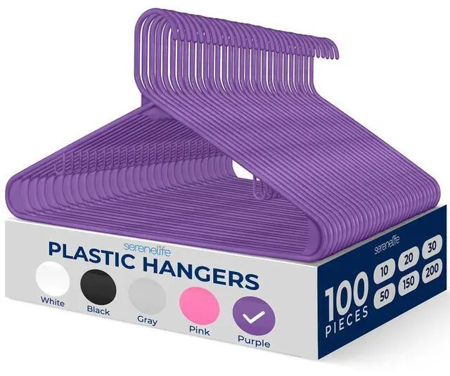 Organize your closet with style and efficiency using the SereneLife SLHPLPURL100 Plastic Hanger Set. This 100-piece set features ultra-thin, space-saving hangers crafted from recycled ABS plastic with a bright purple finish. The hangers are designed to prevent slipping with a secure, smooth surface that holds your clothes in place without damaging fabric. A 360° swivel metal hook offers convenient hanging at any angle. With a lightweight yet durable build, each hanger supports up to 5.5 lbs, making them ideal for shirts, dresses, pants, and coats. Perfect for everyday use at home, in dorms, or in commercial settings.