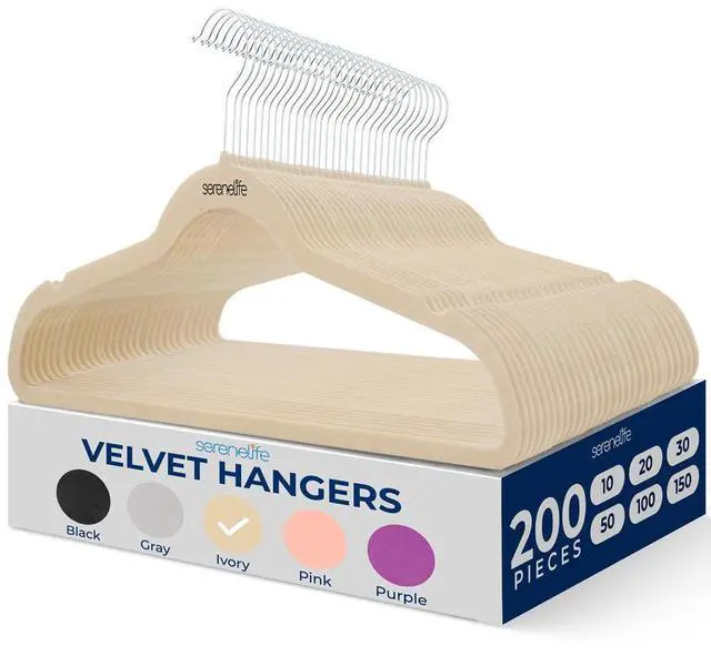 The SereneLife Velvet Hangers offer a stylish and functional solution for your closet. This 200-piece set of non-slip velvet hangers features a 360° swivel hook, making it easy to hang and access your clothes. The velvet-coated surface ensures that your garments stay securely in place, while the space-saving design helps maximize closet space. These hangers are lightweight yet durable, perfect for organizing coats, shirts, dresses, and more. The smooth ivory velvet finish adds a modern and elegant touch to your wardrobe.