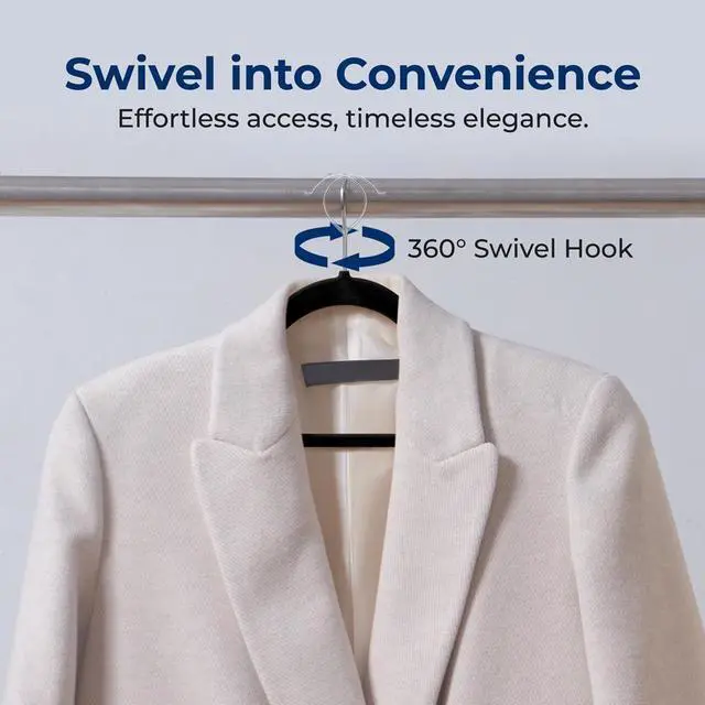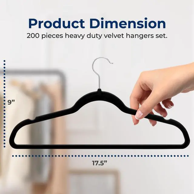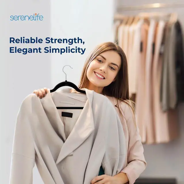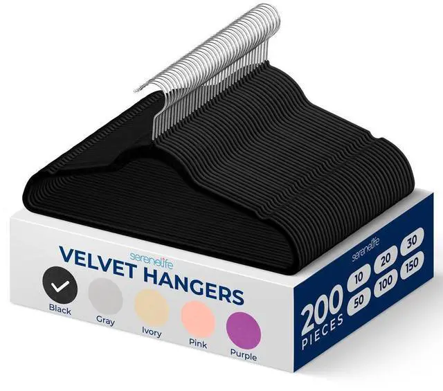 The SereneLife Velvet Hangers provide a reliable and elegant solution for organizing your closet. This 200-piece set of non-slip velvet hangers features a 360° swivel hook, making it easy to hang and access your clothes. The velvet-coated surface ensures your garments stay securely in place, while the space-saving design helps you maximize closet space. These hangers are lightweight yet durable, perfect for organizing coats, shirts, dresses, and more. The smooth black velvet finish adds a modern and sophisticated touch to your wardrobe.