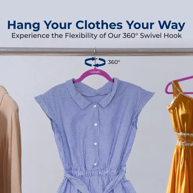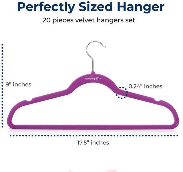 The SereneLife SLHVELPURP20 Velvet Hanger Set is a must-have for anyone looking to organize their closet efficiently. Made from high-quality recycled ABS, velvet, and a sturdy metal hook, these hangers are built to last. The soft velvet coating keeps clothes from slipping, while the 360° swivel hook allows for easy access. The ultra-thin design saves space, and the hangers can hold up to 10 lbs. each. Perfect for coats, dresses, shirts, and delicate fabrics, this 20-piece set is designed to keep your closet neat and tidy.