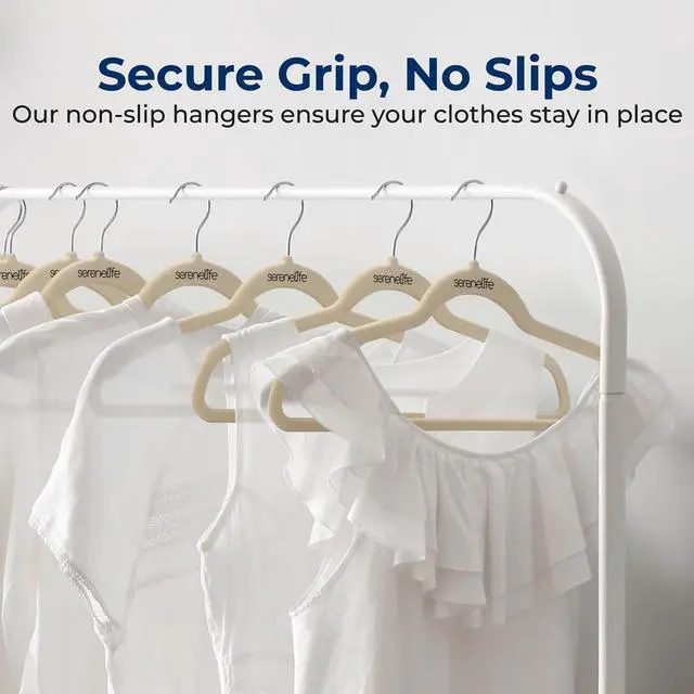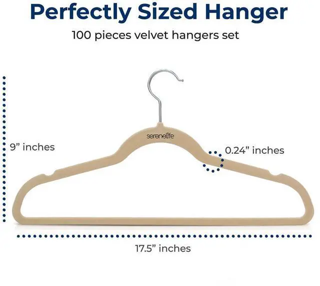 The SereneLife 100-Pack Velvet Non-Slip Hangers in ivory color offer a durable and stylish solution for organizing your closet. These velvet hangers are designed with a 360° swivel hook for easy access and rotation. The non-slip surface keeps clothes securely in place, while the smooth velvet finish helps to preserve the shape and quality of your garments. The ultra-thin design saves space, allowing for a more organized closet. Each hanger supports up to 10 lbs., making them perfect for heavier items like coats and dresses. With a pack of 100, these hangers will keep your closet neat and tidy.