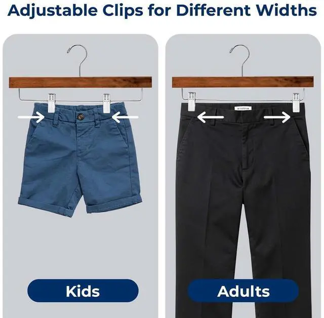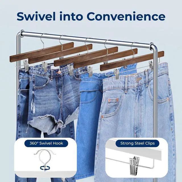 Keep your wardrobe organized and wrinkle-free with SereneLife's 10-piece set of retro-style wooden pants hangers. Designed for functionality and style, each hanger features a 360° chrome swivel hook, strong steel clips, and a durable wooden body. Perfect for jeans, skirts, shorts, or slacks, these hangers offer reliable support and a clean closet aesthetic. Lightweight and space-saving, they are the ideal solution for upgrading your closet.