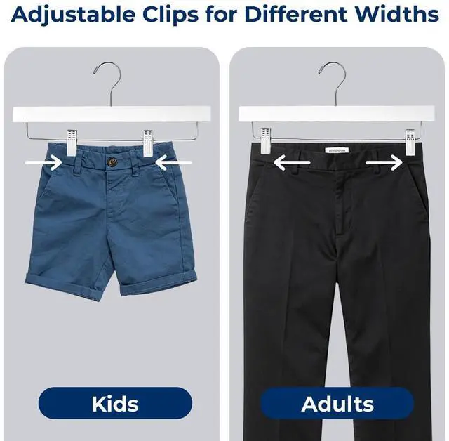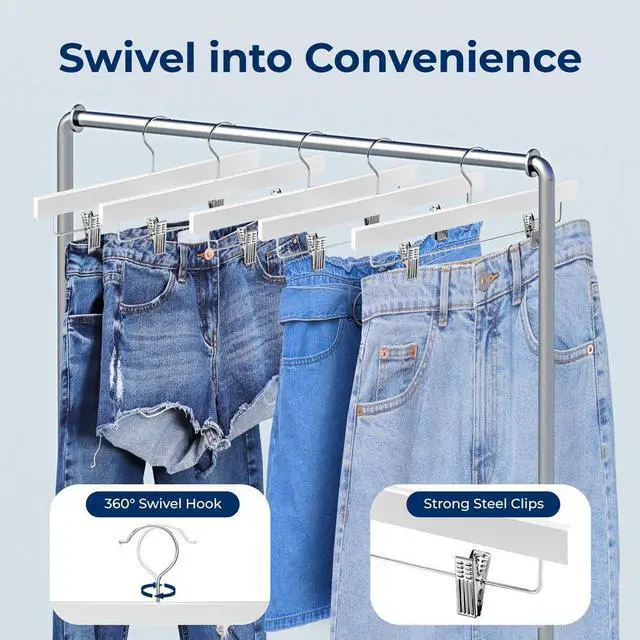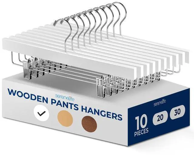 Upgrade your closet with the SereneLife 10-piece White Wooden Hanger Set. These heavy-duty hangers are built from premium wood and offer strong steel clips and a 360° swivel chrome hook. The clean white finish adds a modern vibe while delivering practical support for your favorite pants, shorts, skirts, or jeans. These hangers help maximize your closet space and maintain an organized look.