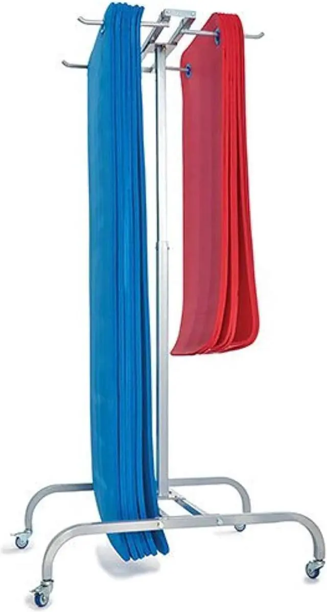 Height and width adjustments allow this rack to work with different length and width hanging mats up to 72? length. Constructed of 1.5? and 1.25? square steel tubing with silver powder coated finish. Holds up to 50 - 48 inch; or 32 - 7mats or a combination of both at the same time. Equipped with 4 non-marring polyurethane swivel casters; 2 locking. This product is manufactured in China.