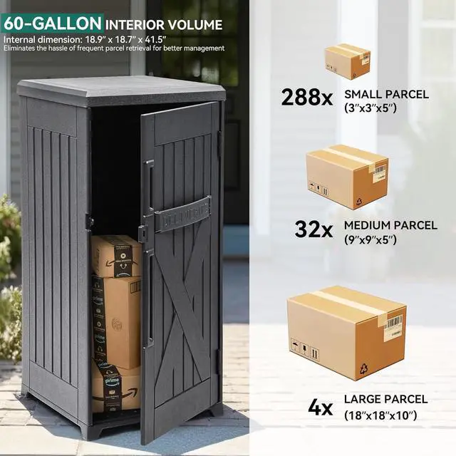 Sturdy and Durable: Premium resin-made box for package delivery can effectively withstand harsh weather conditions such as typhoons, rain, and snow for all season use; Sturdy construction and thick wall panels further extend its service life