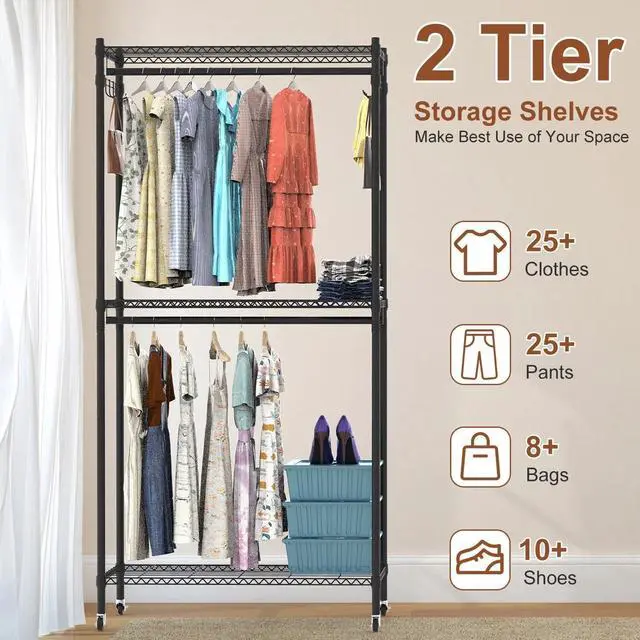 2 Tier Larger Space:Our covered wardrobe rack features a great size of 35.43x17.13x72.44in with 2 tiers,2 hanging rods and 2 hook racks to keep all your daily clothes in one place. Great for your dresses,shirts,pants,coats,bed linens,kids toys,folded clothes,bath towel and extra laundry sundries.