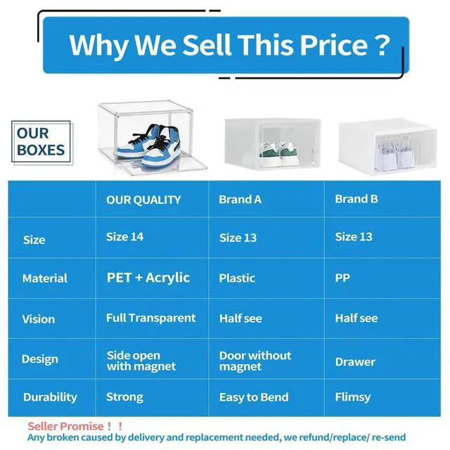 Merchant VideoUnlike other competitor's flimsy boxes, our boxes are made of superior quality and that's why we sell this price. Sturdy, stable , stackable and completely transparent. We provide replacement if any broken caused
