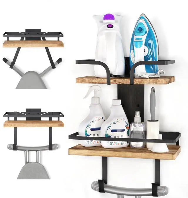 - Unique 2-layer shelves offers larger organization capacity. One more shelf is designed to store more ironing accessories, such as 2 or more irons, water mister, fabric sprays, starch, wrinkle releaser, stain sticks and more. Storing these accessories together to make it easier to grab them when you're ironing.