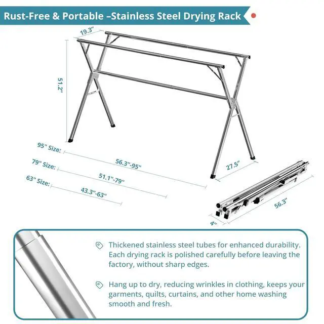 JAUREE Hanging Clothes Drying Rack Space-Saving, Versatile, and Energy Efficient This JAUREE portable clothes drying rack is designed for convenience and durability. Perfect for both indoor and outdoor use. This drying racks for clothes features a collapsible design that folds easily for compact storage. With 3 retractable drying rods, this large drying rack clothing provides ample space for garments, bedding, and even large items like comforters. Clothes racks for hanging clothes to dry is sturdy enough to handle up to 130 lbs of clothes and offers great airflow for quicker drying, saving you energy and reducing your electricity bills. Easy to set up in minutes with no assembly required, this air dry rack for clothes is lightweight and portable, allowing you to move it effortlessly to any spot in your yard, closet, or home. When you're done, simply fold it up and store it in a small space perfect for saving room in your home! Save energy, reduce dryer wear, and keep your clothes smelling fresh with the JAUREE inside clothes drying rack!