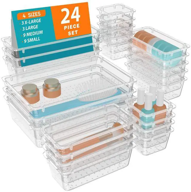 24 PCS Clear Plastic Drawer Organizer Set, 4 Sizes Desk Drawer Organization and Storage Containers for Makeup, Cosmetics, Jewelry and Gadgets in Kitchen, Bathroom, Bedroom, Office, Clear