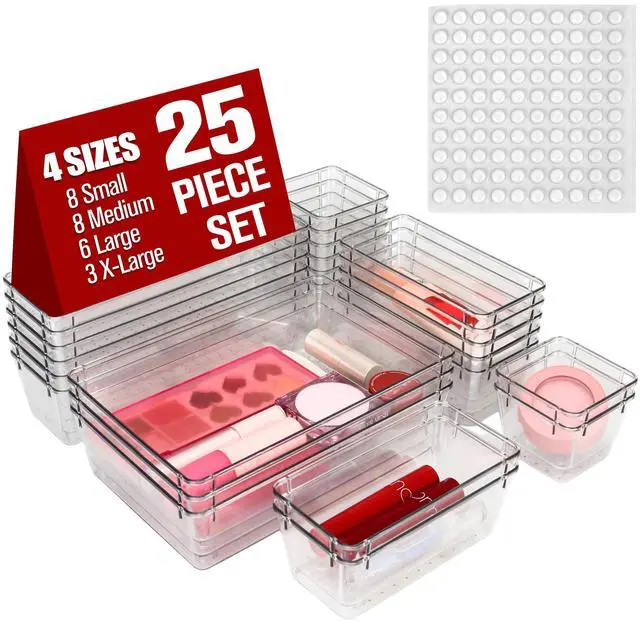25-Piece Set with 4 Sizes Includes 3 bins (9" x 6" x 2"), 6 bins (9" x 3" x 2"), 8 bins (6" x 3" x 2"), and 8 bins (3" x 3" x 2"), plus 100 non-slip silicone adhesive dots to keep trays securely in place; great as drawer dividers for dorm rooms, junk drawers, and more.