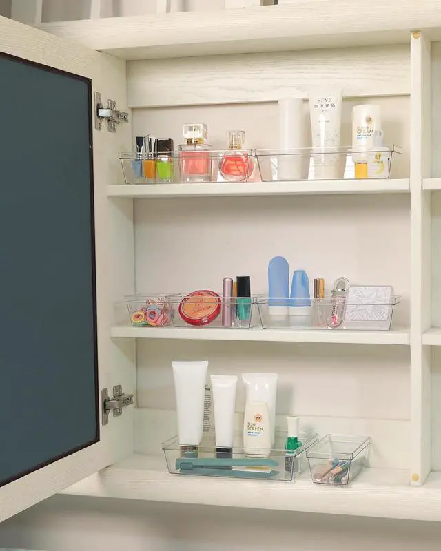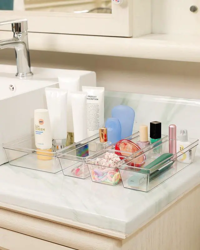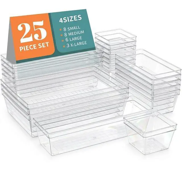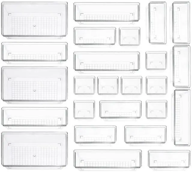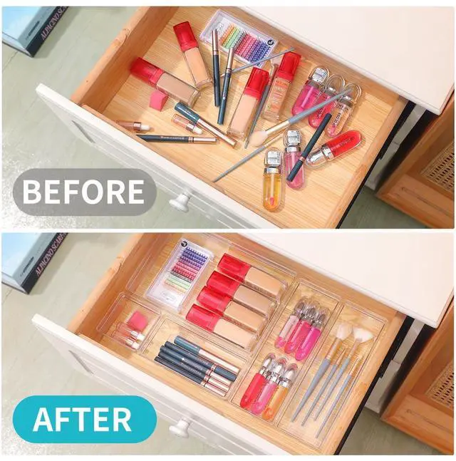 Stay Organized: Drawer organizers makeup vanity drawer organizer make organization a part of your life. Bathroom drawer organizer trays organize your storage space in home Save Space drawer organization: Makeup organizer for drawer make more space at home for daily storage Easy to clean makeup drawer organizer trays: Simply wipe the drawer organizer bathroom bathroom organizer drawer or a quick water rinse drawer makeup organizer to get dust and dirt off the make up drawer organizer set Multipurpose clear plastic drawer organizer: Our drawer organizer tray are designed to be used in multiple situations, with different drawer storage containers tray sizes to customize your storage space Plastic drawer organizer package Includes: 9 x 6 x 2 inches (3 pcs) 9 x 3 x 2 inches (6 pcs) 6 x 3 x 2 inches (8 pcs) 3 x 3 x 2 inches (8 pcs)