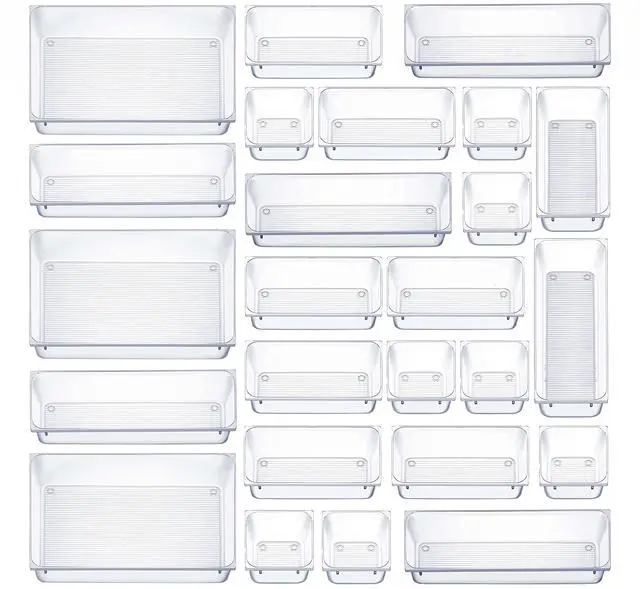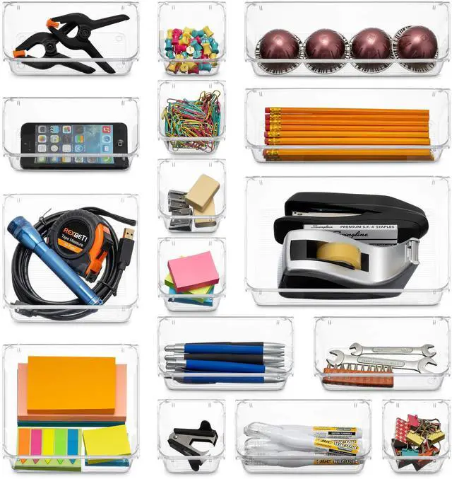 Keep your Desks, Drawers, Dressers or Vanity neatly organized with these Multipurpose Clear Plastic organizer storage Trays. Practical design to help maximize your space. Use them side by side to keep items organized and easy to find. Ideal for kitchen drawers, vanity drawers, desk drawers, dresser drawers, pantry drawers. Great for closets, bedrooms, bathrooms, laundry rooms, craft rooms, mudrooms, offices, play rooms, garages, or any room of your home / apartment / condo / dorm room / RV or camper Great for storing organizing cosmetics, makeup tools, hair accessories, jewelry, office supplies, craft supplies, utensils, etc. Made of durable high quality BPA Free shatter-resistant plastic.
