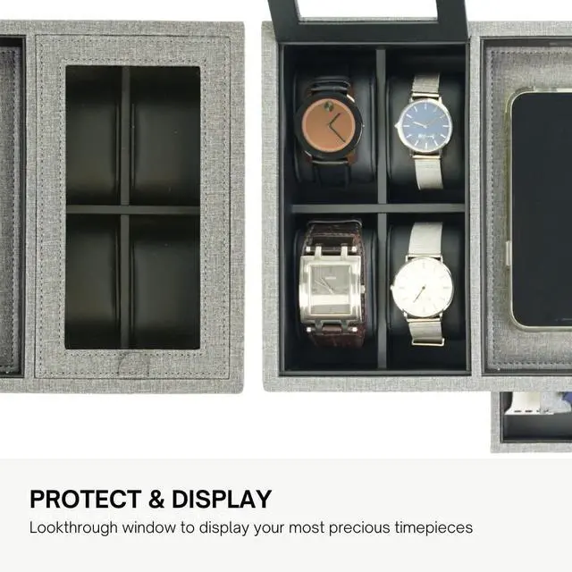 Left Slot / Watch Box: 4 watches slot with black soft cushions in each slot and a clear glass top window specific to this slot to take a look inside; Dimension of whole slot: (H 8x W 4.50 x W 3.25) inches and Dimension of each watch slot: (H 4 x W 2.25) inches.
