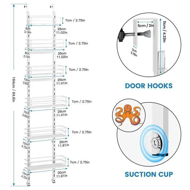 - NOTE: Please measure the size of your pantry door before purchasing our over the door pantry organizer.Please make sure the width of the door is greater than 11.8 inches (30 cm, excluding the handle);Make sure the depth of the inner space of the pantry or the space behind the door is greater than 4.92 inches (12.5 cm) to avoid blocking the door from closing;The thickness of the door needs to be less than 2 inches (5 cm),and the clearance at the top of the door needs to be greater than 0.8 inches (2 mm) to accommodate the hooks