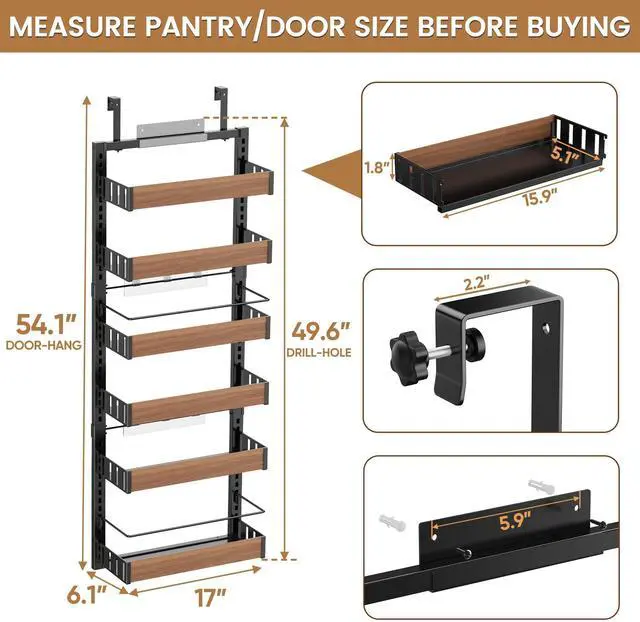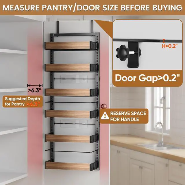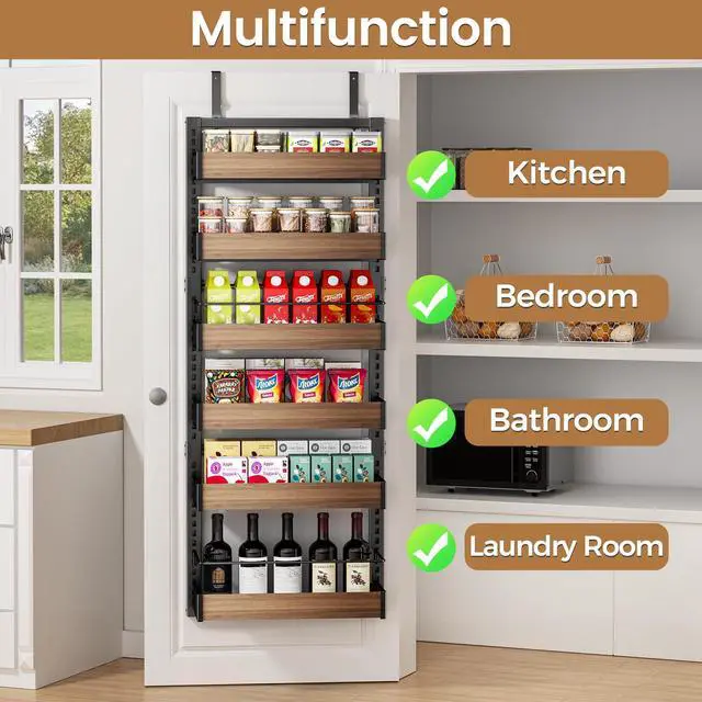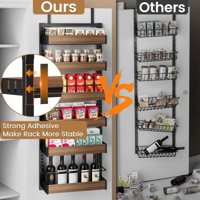 ADJUSTABLE SHELF HEIGHTS FOR VERSATILE STORAGE: With 5 baskets measuring 9/5 inches in height and 3 baskets measuring 16/5 inches in height, our over the door organizer is perfect for storing different-sized spice jars, snacks, and more. The 3 taller baskets are specifically designed to secure taller items and prevent them from falling.