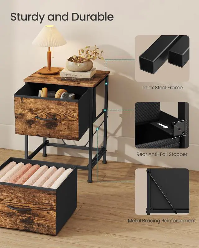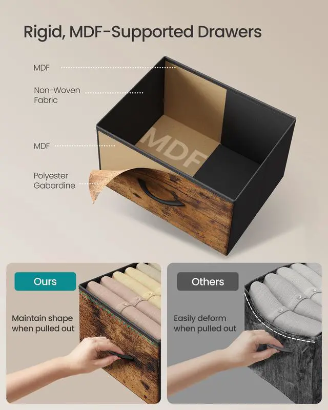 - Sturdy Construction: Built with a steel frame, a particleboard top, and non-woven fabric drawers with MDF structures, ensuring lasting durability and strength.